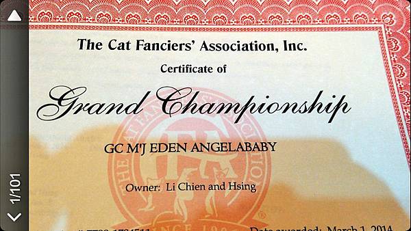 也感謝美國CFA總部寄來的總冠軍證書! 米吉會繼續培育更優質的波斯 加菲喔! 期待中!
